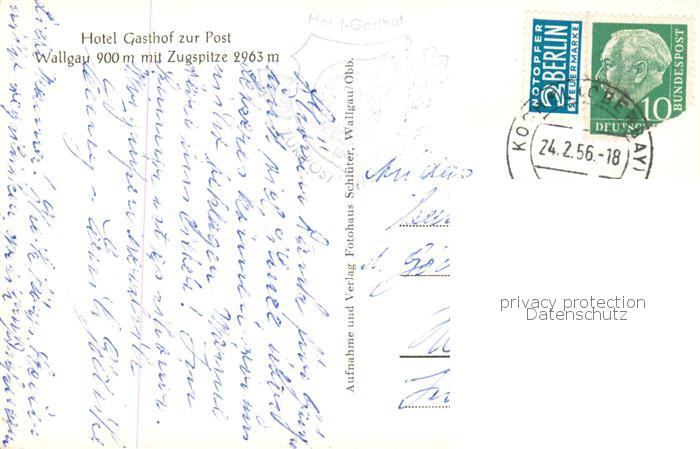 73810976 alte Postkarte Wallgau Hotel Gasthof zur Post Blick gegen Zugspitze Wettersteingebirge postalisch gelaufen Erhaltung siehe scans [FriedD77] KatCode: 11110009180136