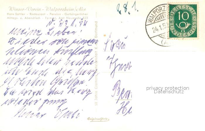 73644636 alte Postkarte Walporzheim Hans Sattler Restaurant Pension Winzerverein Bunte Kuh Felsen an der Ahr postalisch gelaufen Erhaltung siehe scans [FriedD77] KatCode: 11110007131007