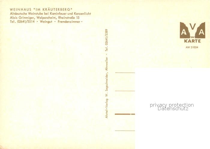73680773 Walporzheim Weinhaus Kraeuterberg Ahrtal postalisch nicht gelaufen Erhaltung siehe scans [LiesaD40] KatCode: 11110007131007