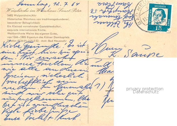 73054684 alte Postkarte Walporzheim Weinhaus postalisch gelaufen Erhaltung siehe scans [NatalD47] KatCode: 11110007131007