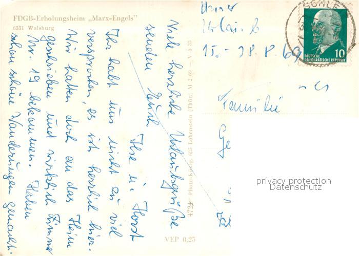 73712670 alte Postkarte Walsburg FDGB Erholungsheim Marx Engels postalisch gelaufen Erhaltung siehe scans [FriedD77] KatCode: 11110016075127