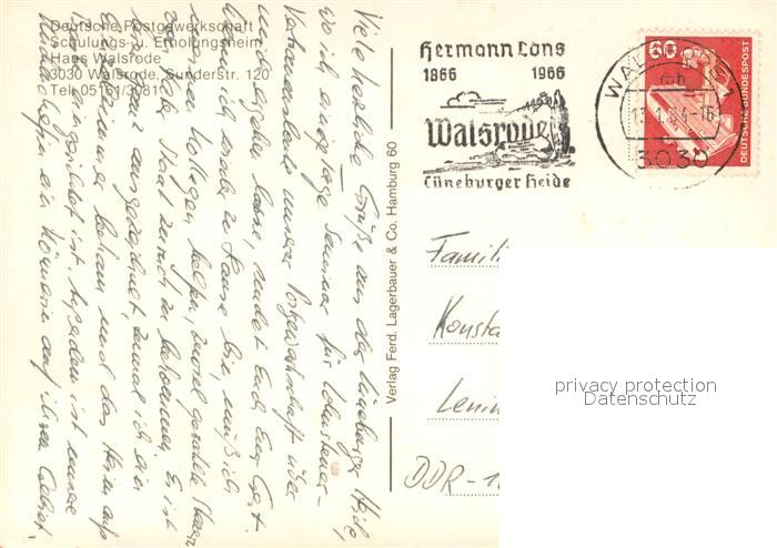 73646996 alte Postkarte Walsrode Lueneburger Heide Haus Walsrode Deutsche Postgewerkschaft Schulungsheim Gastraeume Kegelbahn postalisch gelaufen Erhaltung siehe scans [WerneD78] KatCode: 11110003358022