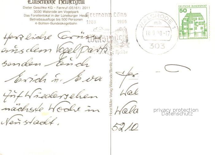 73110296 alte Postkarte Walsrode Lueneburger Heide Restaurant Luisenhoehe Heidiergrill postalisch gelaufen Erhaltung siehe scans [NatalD47] KatCode: 11110003358022