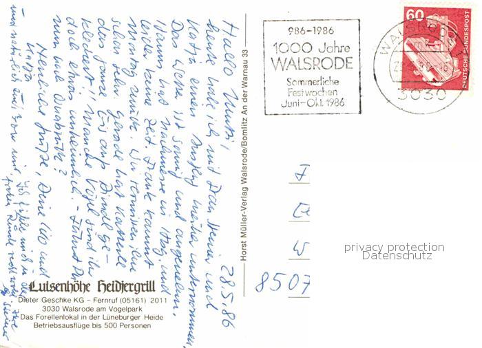 72756287 alte Postkarte Walsrode Lueneburger Heide Vogelpark Luisenhoehe Heidjergrill postalisch gelaufen Erhaltung siehe scans [LiesaD40] KatCode: 11110003358022