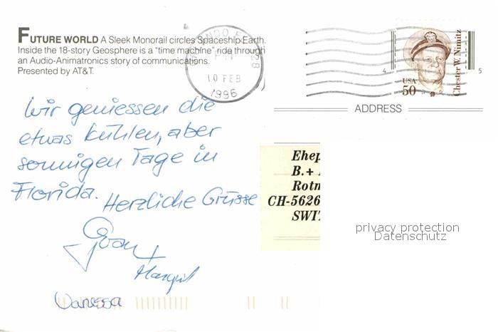 72678253 old postcard Walt Disney World Future World Sleek Monorail Spaceship Earth postalisch gelaufen Erhaltung siehe scans [PaolaD17] KatCode: 14140110000000