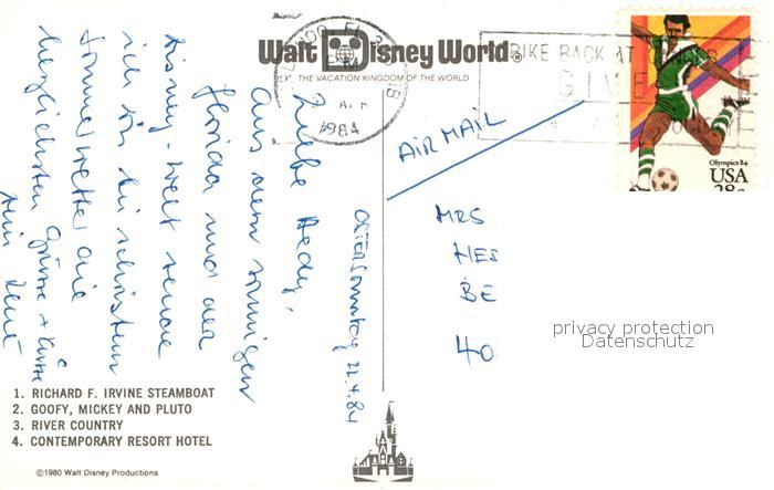 72944306 old postcard Walt Disney World Richard F. Irvine Steamboat Goofy Mickey Pluto Resort Hotel postalisch gelaufen Erhaltung siehe scans [PaolaD17] KatCode: 14140110000000