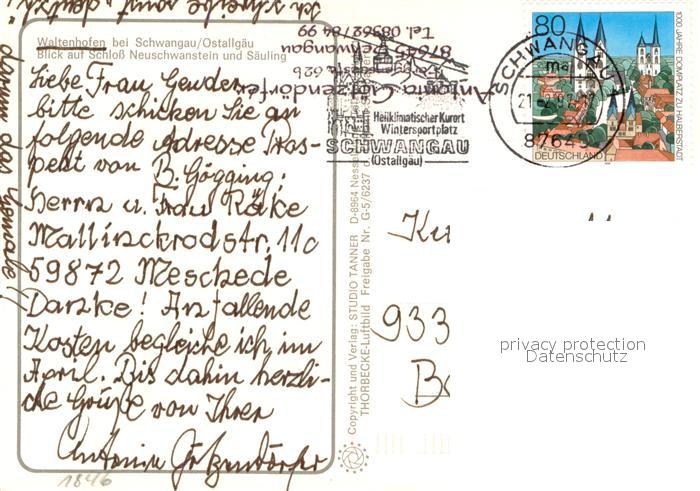 73744801 alte Postkarte Waltenhofen Schwangau Fliegeraufnahme mit Schloss Neuschwanstein postalisch gelaufen Erhaltung siehe scans [FriedD77] KatCode: 11110009777169