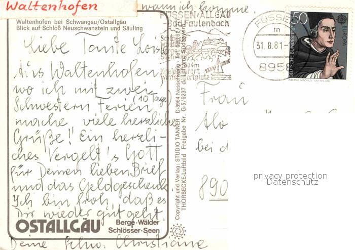 72836382 alte Postkarte Waltenhofen Schwangau Schloss Neuschwanstein Saeuling postalisch gelaufen Erhaltung siehe scans [NatalD47] KatCode: 11110009777169
