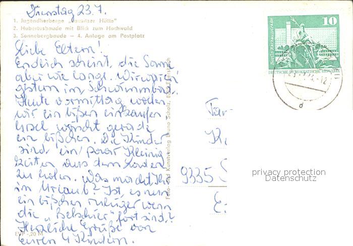 72357839 alte Postkarte Waltersdorf Zittau Jugendherberge Lausitzer Huette Hubertusbaude Hochwald Sonnebergbaude Postplatz postalisch gelaufen Erhaltung siehe scans KatCode: 11110014286120