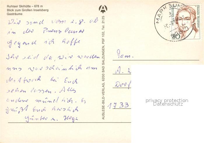 73643055 alte Postkarte Waltershausen Gotha Ruhlaer Skihuette im Thueringer Wald Grosser Inselsberg postalisch gelaufen Erhaltung siehe scans [FriedD77] KatCode: 11110016067072