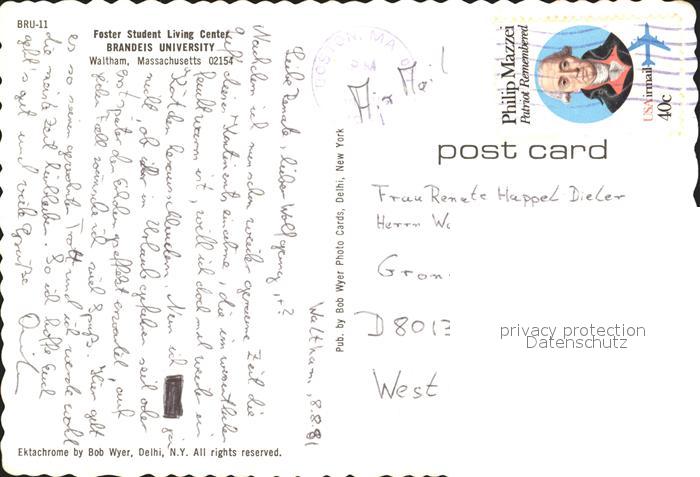 72153364 old postcard Waltham Massachusetts Foster Student Living Center Brandeis University postalisch gelaufen Erhaltung siehe scans KatCode: 14140230000000