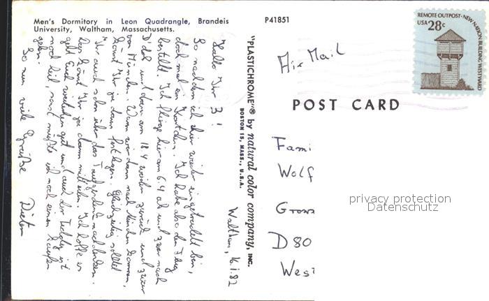 72154522 old postcard Waltham Massachusetts Mens Dormitory in Leon Quadrangle Brandeis University postalisch gelaufen Erhaltung siehe scans KatCode: 14140230000000