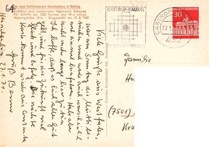 73933010 Waltrop Recklinghausen NRW Neues Schiffshebewerk Henrichenburg postalisch gelaufen Erhaltung siehe scans [FriedD77] alte Postkarte Frie Katcode 11110005562036