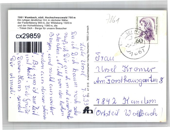 30923895 alte Postkarte Wambach Kleines Wiesental postalisch gelaufen KatCode: 11110008336097