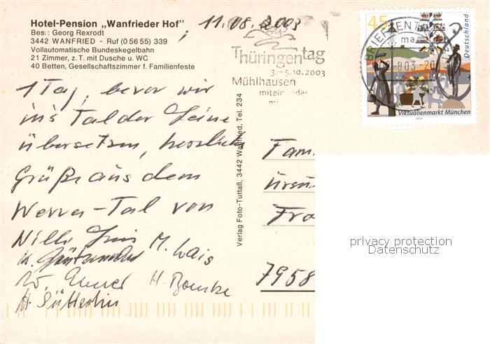73844991 alte Postkarte Wanfried Hotel Pension Wanfrieder Hof Gaststube Ortsstrasse postalisch gelaufen Erhaltung siehe scans [WerneD78] KatCode: 11110006636013