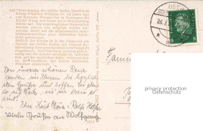 74030334 old postcard Wang Kirche Wang Brueckenberg Karpacz Gorny PL Kirche Wang im Riesengebirge postalisch gelaufen Erhaltung siehe scans [FriedD77] KatCode: 11410