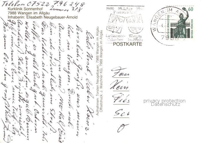 73790838 alte Postkarte Wangen Allgaeu Kurklinik Sonnenhof Hallenbad Restaurant Stadtzentrum postalisch gelaufen Erhaltung siehe scans [FriedD77] KatCode: 11110008436081