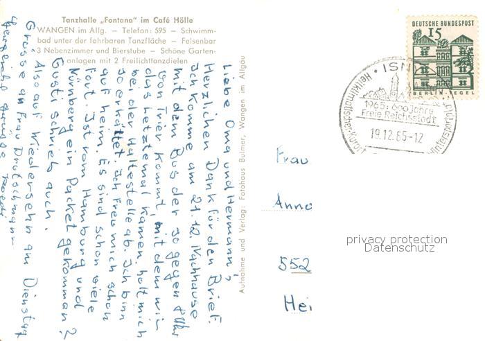 73653374 alte Postkarte Wangen Allgaeu Tanzhalle Fontana im Cafe Hoelle postalisch gelaufen Erhaltung siehe scans [WerneD78] KatCode: 11110008436081