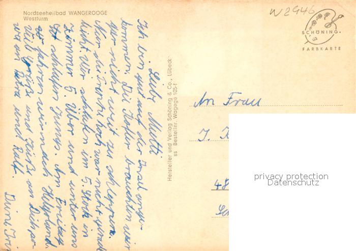 73083471 alte Postkarte Wangerooge Nordseebad Westturm postalisch gelaufen Erhaltung siehe scans [KathaD81] KatCode: 11110003455021