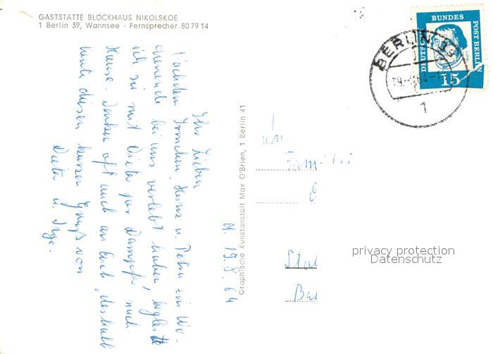 72967621 alte Postkarte Wannsee Gaststaette Blockhaus Nikolskoe postalisch gelaufen Erhaltung siehe scans [NatalD47] KatCode: 11110011000000