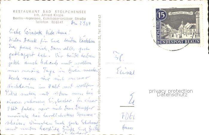 72296349 alte Postkarte Wannsee Restaurant Bad Stoelpchensee postalisch gelaufen Erhaltung siehe scans KatCode: 11110011000000