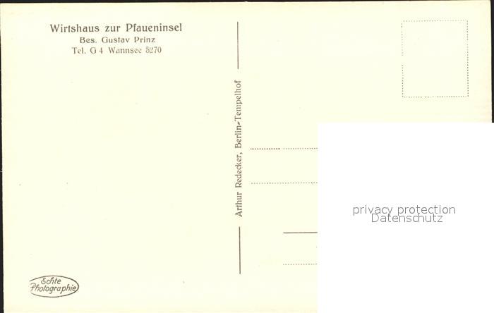 31715096 Wannsee Wirtshaus zur Pfaueninsel Gustav Prinz postalisch nicht gelaufen Erhaltung siehe scans KatCode: 11110011000000