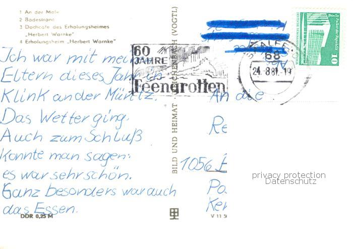 73752709 alte Postkarte Waren Klink FDGB Ferienobjekt An der Mole Badestrand Dachcafe und Erholungsheim Herbert Warnke postalisch gelaufen Erhaltung siehe scans [WerneD78] KatCode: 11110013056072