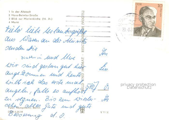 73669359 alte Postkarte Waren Mueritz Altstadt Hans Beimler Strasse Marienkirche 14. Jhdt. Markt postalisch gelaufen Erhaltung siehe scans [FriedD77] KatCode: 11110013056072