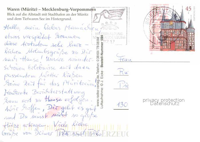 72638209 alte Postkarte Waren Mueritz Altstadt mit Stadthafen und Tiefwarensee Fliegeraufnahme postalisch gelaufen Erhaltung siehe scans [WerneD78] KatCode: 11110013056072