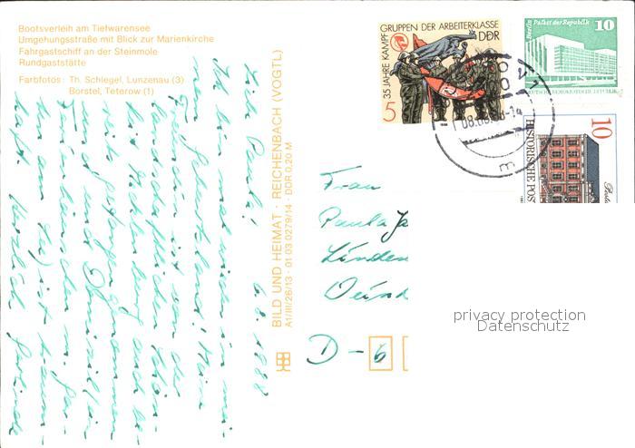 72022194 alte Postkarte Waren Mueritz Bootsverleih Tiefwarensee Umgehungsstrasse Marienkirche Fahrgastschiff Rundgaststaette postalisch gelaufen Erhaltung siehe scans KatCode: 11110013056072