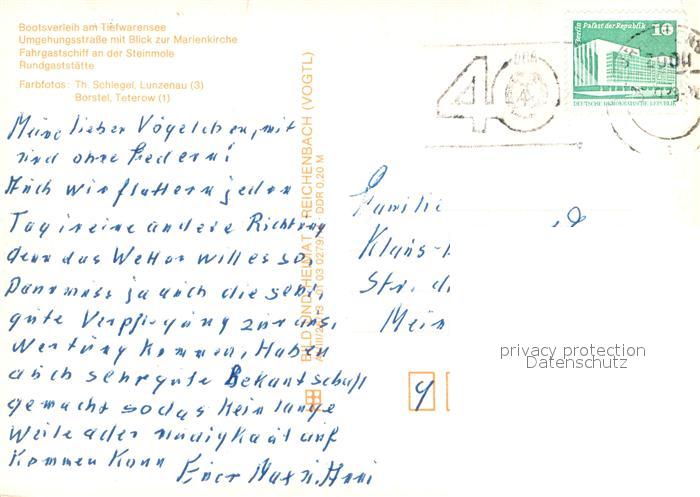 73655150 alte Postkarte Waren Mueritz Bootsverleih Tiefwarensee Umgehungsstrasse Marienkirche Fahrgastschiff Steinmole Rundgaststaette postalisch gelaufen Erhaltung siehe scans [FriedD77] KatCode: 11110013056072