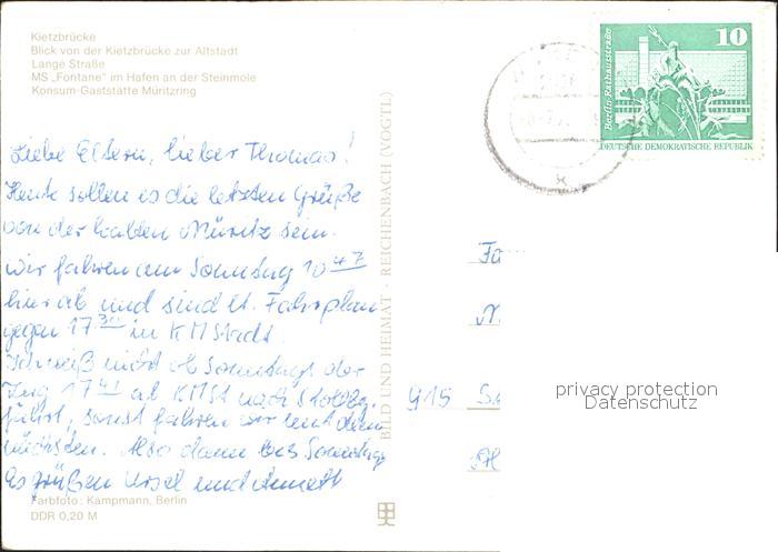 72335191 alte Postkarte Waren Mueritz Kietzbruecke Altstadt Lange Strasse MS Fontane Hafen Mole Konsum Gaststaette Mueritzring postalisch gelaufen Erhaltung siehe scans KatCode: 11110013056072