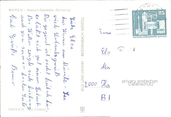 72032294 alte Postkarte Waren Mueritz Konsum Gaststaette Mueritzring postalisch gelaufen Erhaltung siehe scans KatCode: 11110013056072