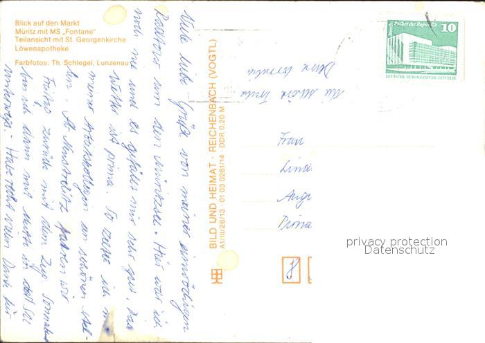 72412060 alte Postkarte Waren Mueritz Loewenapotheke St. Georgenkirche postalisch gelaufen Erhaltung siehe scans KatCode: 11110013056072