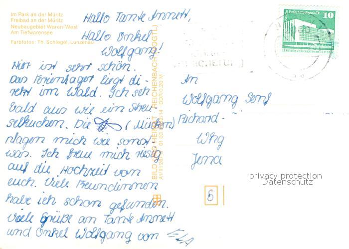 72972883 alte Postkarte Waren Mueritz Park an der Mueritz Freibad Neubaugebiet Tiefwarensee Mecklenburgische Seenplatte postalisch gelaufen Erhaltung siehe scans [FriedD77] KatCode: 11110013056072