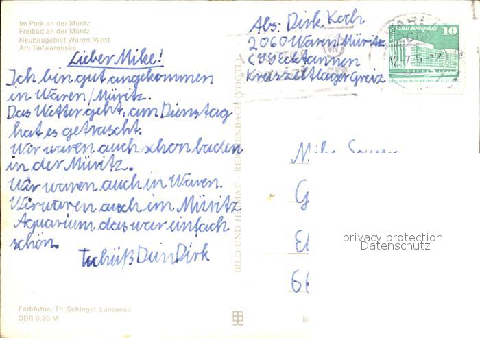 72247104 alte Postkarte Waren Mueritz Park Schwaene Freibad Neubaugebiet Tiefwarensee postalisch gelaufen Erhaltung siehe scans KatCode: 11110013056072