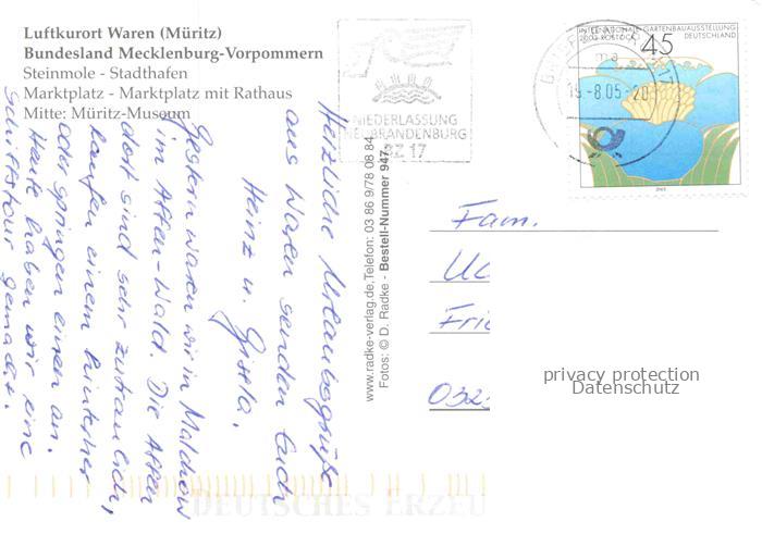 74138835 alte Postkarte Waren Mueritz Steinmole Stadthafen Marktplatz Rathaus Mueritz Museum postalisch gelaufen Erhaltung siehe scans [FriedD77] KatCode: 11110013056072