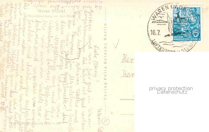72643807 alte Postkarte Waren Mueritz Sturmbrandung an der Mole Mecklenburgische Seenplatte postalisch gelaufen Erhaltung siehe scans [FriedD77] KatCode: 11110013056072