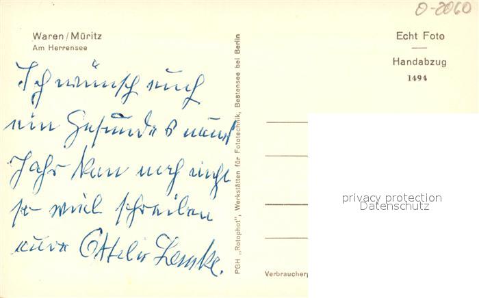 43369885 Waren Mueritz Uferpartie am Herrensee Schwaene Handabzug postalisch nicht gelaufen Erhaltung siehe scans [FriedD77] KatCode: 11110013056072