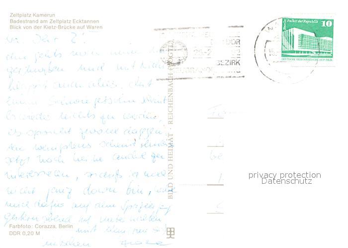 72939403 alte Postkarte Waren Mueritz Zeltplatz Kamerun Badestrand Kietz Bruecke postalisch gelaufen Erhaltung siehe scans [WerneD78] KatCode: 11110013056072