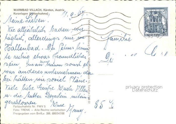 72537624 alte Postkarte Warmbad Villach Fliegeraufnahme Kuranlagen postalisch gelaufen Erhaltung siehe scans [AndreD76 kt119box] KatCode: 11390211020201