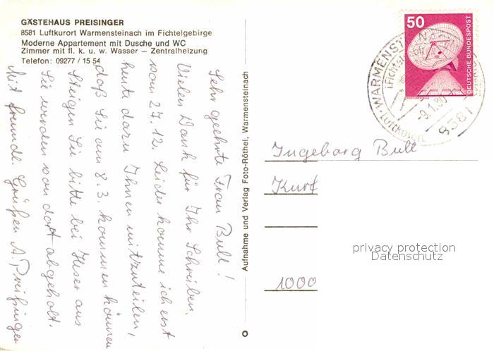 72666417 alte Postkarte Warmensteinach Gaestehaus Preisinger Luftkurort Nachtaufnahme im Winter postalisch gelaufen Erhaltung siehe scans [FriedD77] KatCode: 11110009472198