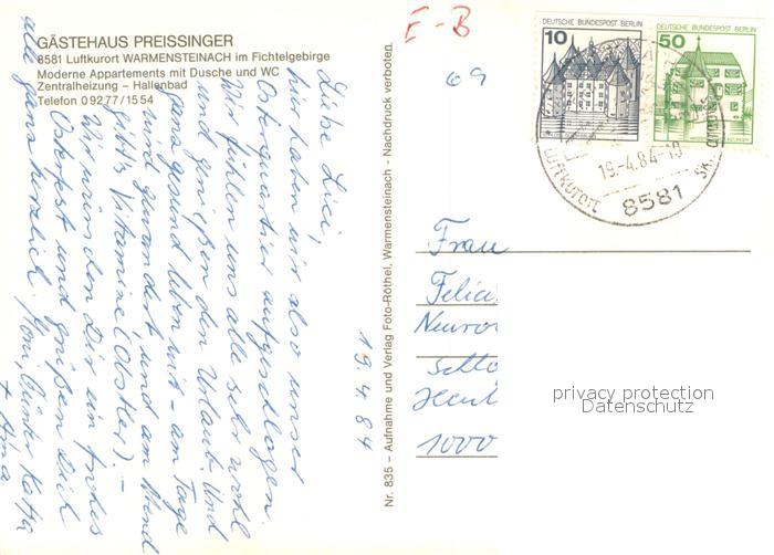 73726357 alte Postkarte Warmensteinach Gaestehaus Preissinger postalisch gelaufen Erhaltung siehe scans [FriedD77] KatCode: 11110009472198