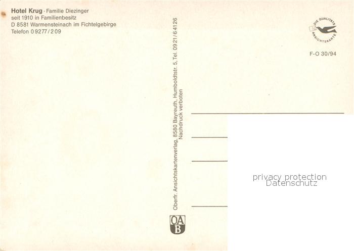 73711770 Warmensteinach Hotel Krug postalisch nicht gelaufen Erhaltung siehe scans [WerneD78] KatCode: 11110009472198