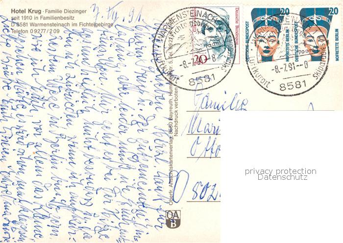 73170544 alte Postkarte Warmensteinach Hotel Krug Gartenrestaurant postalisch gelaufen Erhaltung siehe scans [FriedD77] KatCode: 11110009472198
