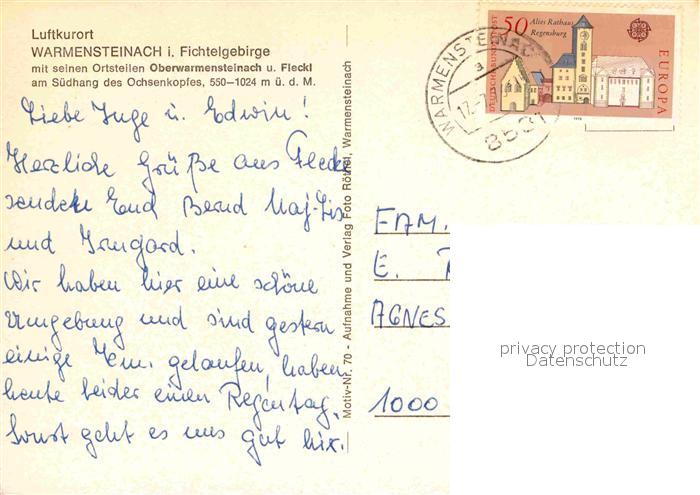 72760273 alte Postkarte Warmensteinach Panorama OT Oberwarmensteinach und Fleckl am Ochsenkopf Fichtelgebirge Loechleinstal Wassertretbecken postalisch gelaufen Erhaltung siehe scans [FriedD77] KatCode: 11110009472198