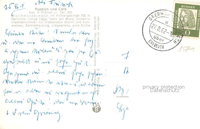 43347709 alte Postkarte Warmensteinach Pension Poehner postalisch gelaufen Erhaltung siehe scans [WerneD78] KatCode: 11110009472198