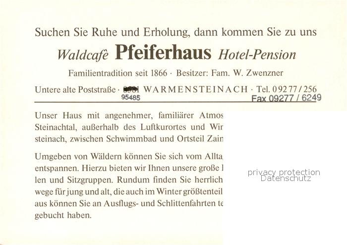 73050771 Warmensteinach Waldhotel Pfeiferhaus postalisch nicht gelaufen Werbekarte (keine Postkarte) Erhaltung siehe scans [KathaD81] KatCode: 11110009472198