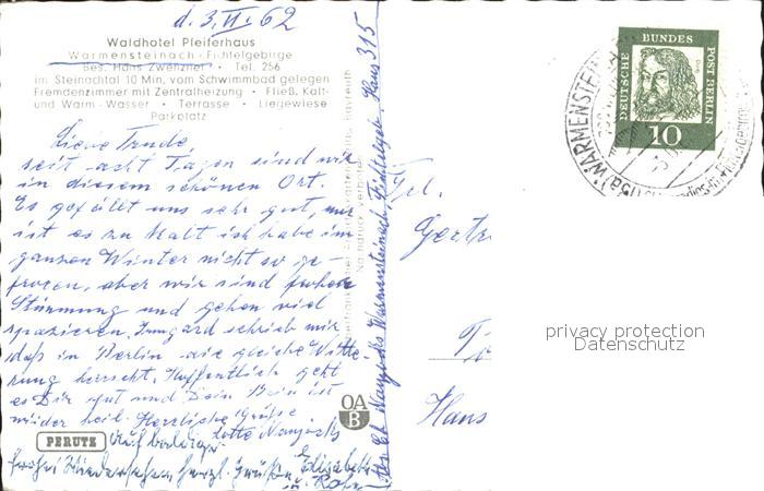 72272339 alte Postkarte Warmensteinach Waldhotel Pfeiferhaus postalisch gelaufen Erhaltung siehe scans KatCode: 11110009472198