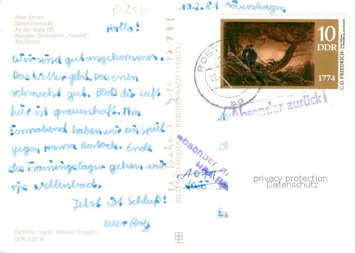 72960966 alte Postkarte Warnemuende Ostseebad Alter Strom Fischkutter Seepromenade Mole Konsum Gaststaette Teepott Leuchtturm Faehre postalisch gelaufen Erhaltung siehe scans [FriedD77] KatCode: 11110013003000
